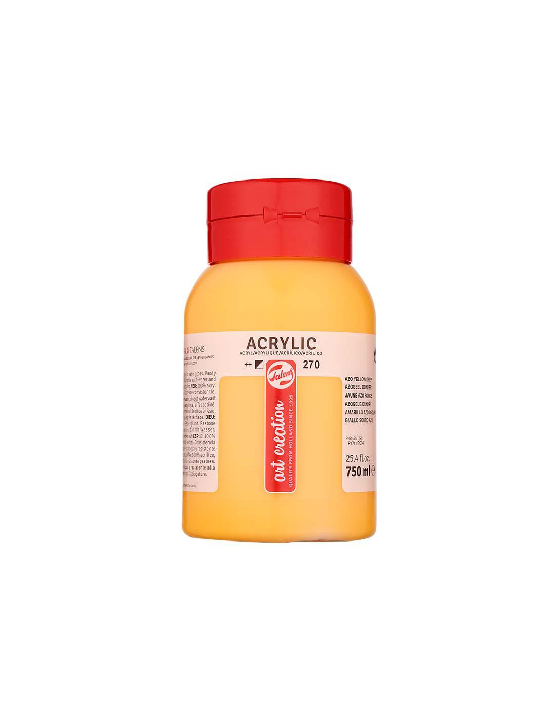ACRILICO TALENS ART CREATION BOTE 750 ML AMARILLO AZO OSCURO 270 Un acrílico de calidad fiable a base del 100% de resina de acrilato. La pintura es pastosa, cuando está seca tiene un brillo sedoso y se puede sobrepintar casi de inmediato. Amarillo Azo Oscuro (270) es un color semiopaco con una resistencia a la luz muy buena (++)