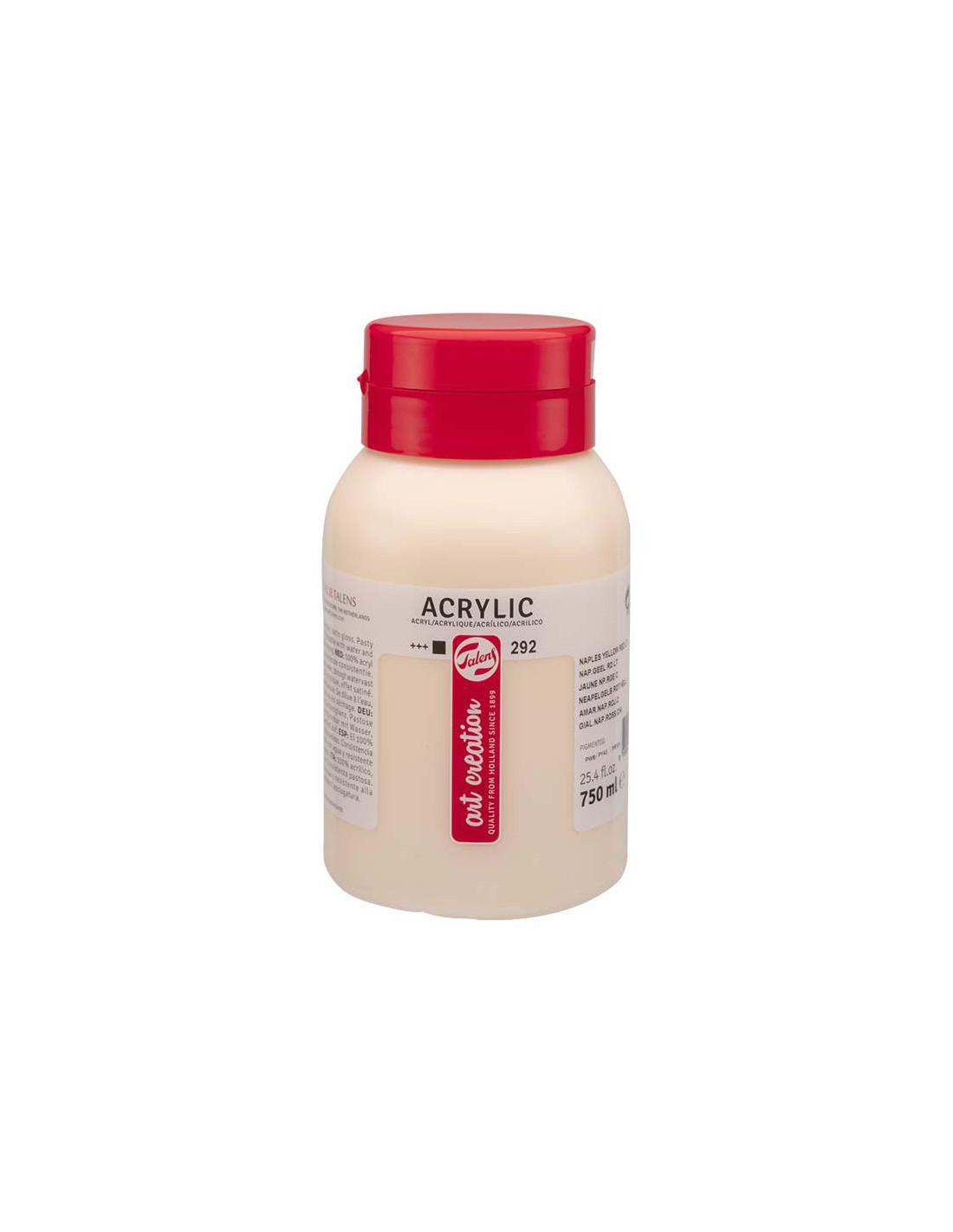 ACRILICO TALENS ART CREATION BOTE 750 ML AMARILLO NÁPOLES ROJO CLARO 292 Un acrílico de calidad fiable a base del 100% de resina de acrilato. La pintura es pastosa, cuando está seca tiene un brillo sedoso y se puede sobrepintar casi de inmediato. Amarillo Nápoles Rojo Claro (292) es un color opaco con una excelente resistencia a la luz (+++)