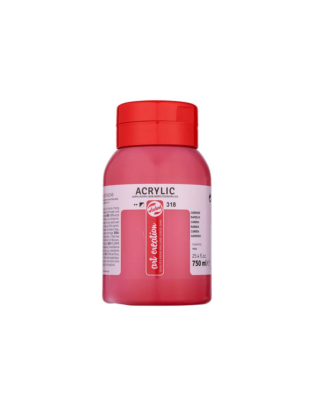 ACRILICO TALENS ART CREATION BOTE 750 ML CARMÍN 318 Un acrílico de calidad fiable a base del 100% de resina de acrilato. La pintura es pastosa, cuando está seca tiene un brillo sedoso y se puede sobrepintar casi de inmediato. Carmín (318) es un color semiopaco con una resistencia a la luz muy buena (++)