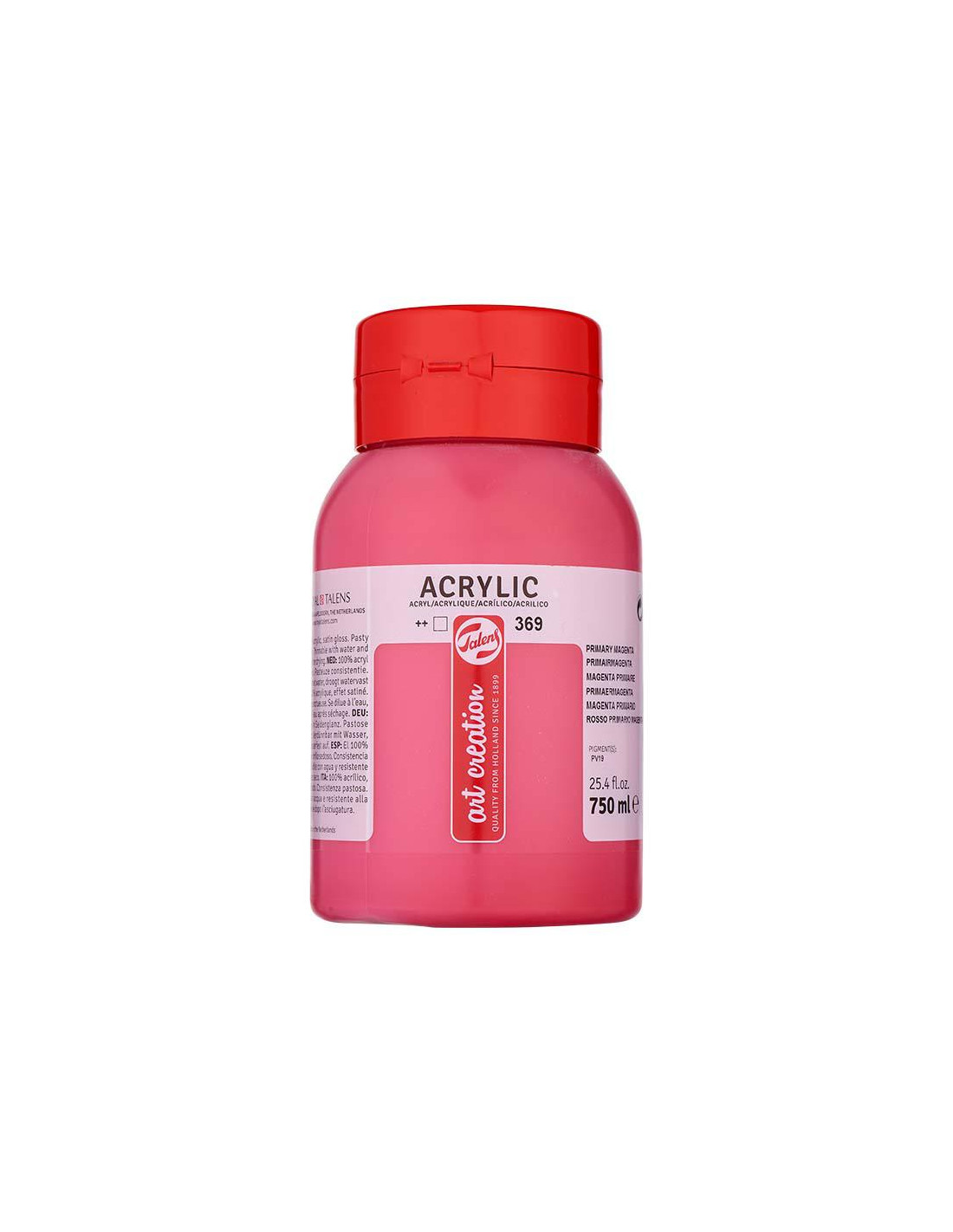ACRILICO TALENS ART CREATION BOTE 750 ML MAGENTA PRIMARIO 369 Un acrílico de calidad fiable a base del 100% de resina de acrilato. La pintura es pastosa, cuando está seca tiene un brillo sedoso y se puede sobrepintar casi de inmediato. Magenta Primario (369) es un color transparente con una excelente resistencia a la luz (++)