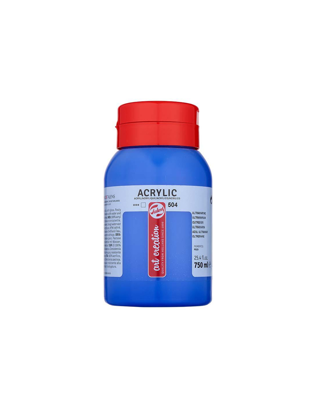 ACRILICO TALENS ART CREATION BOTE 750 ML AZUL ULTRAMAR 504 Un acrílico de calidad fiable a base del 100% de resina de acrilato. La pintura es pastosa, cuando está seca tiene un brillo sedoso y se puede sobrepintar casi de inmediato. Azul Ultramar (504) es un color transparente con una excelente resistencia a la luz (+++)