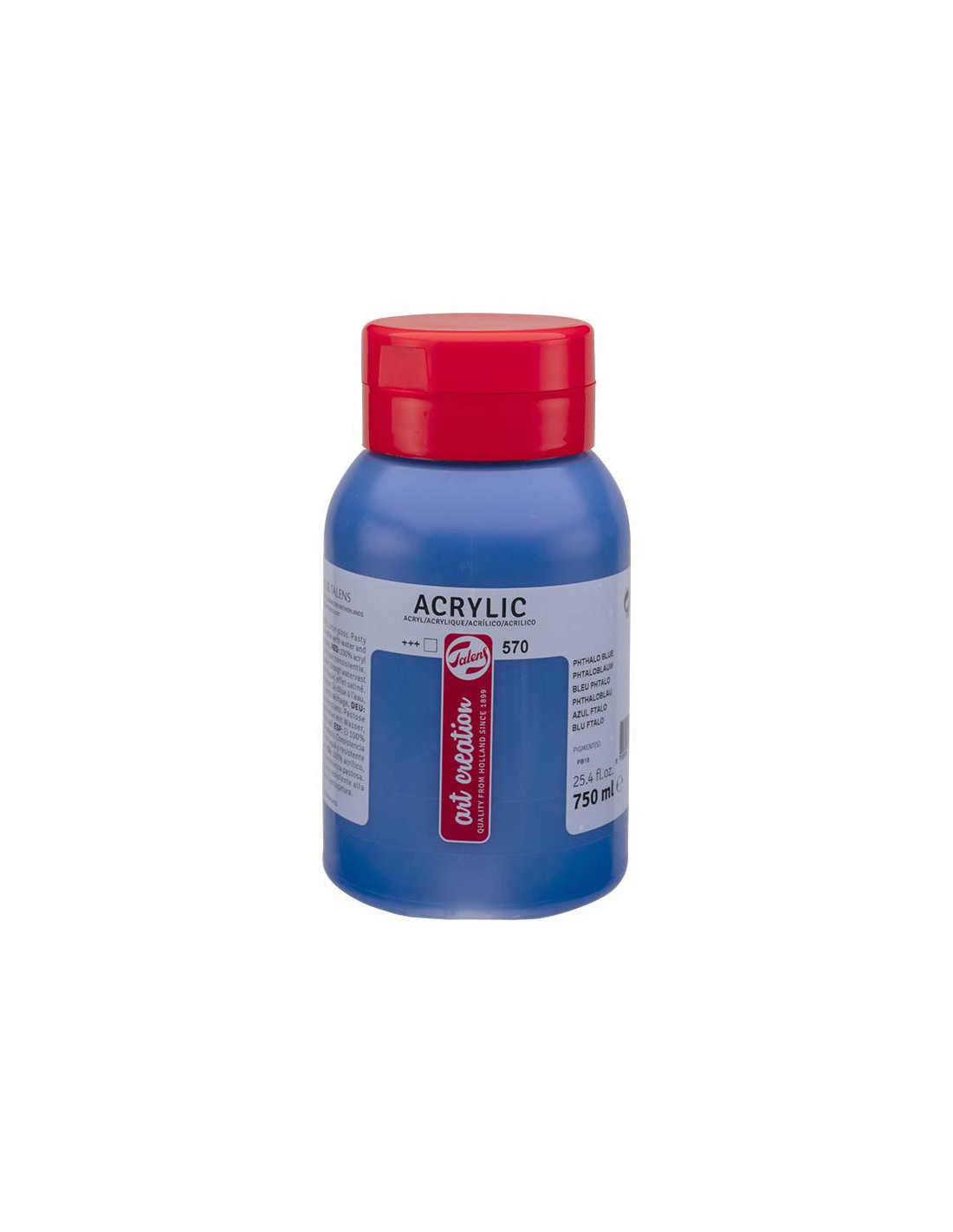 ACRILICO TALENS ART CREATION BOTE 750 ML AZUL FTALO 570 Un acrílico de calidad fiable a base del 100% de resina de acrilato. La pintura es pastosa, cuando está seca tiene un brillo sedoso y se puede sobrepintar casi de inmediato. Azul Ftalo (570) es un color transparente con una excelente resistencia a la luz (+++)