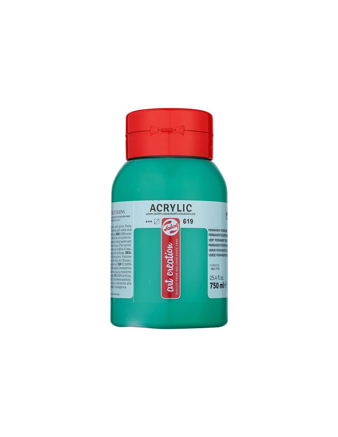 ACRILICO TALENS ART CREATION BOTE 750 ML VERDE PERMANENTE OSCURO 619 Un acrílico de calidad fiable a base del 100% de resina de acrilato. La pintura es pastosa, cuando está seca tiene un brillo sedoso y se puede sobrepintar casi de inmediato. Verde Permanente Oscuro (619) es un color semitransparente con una excelente resistencia a la luz (+++)