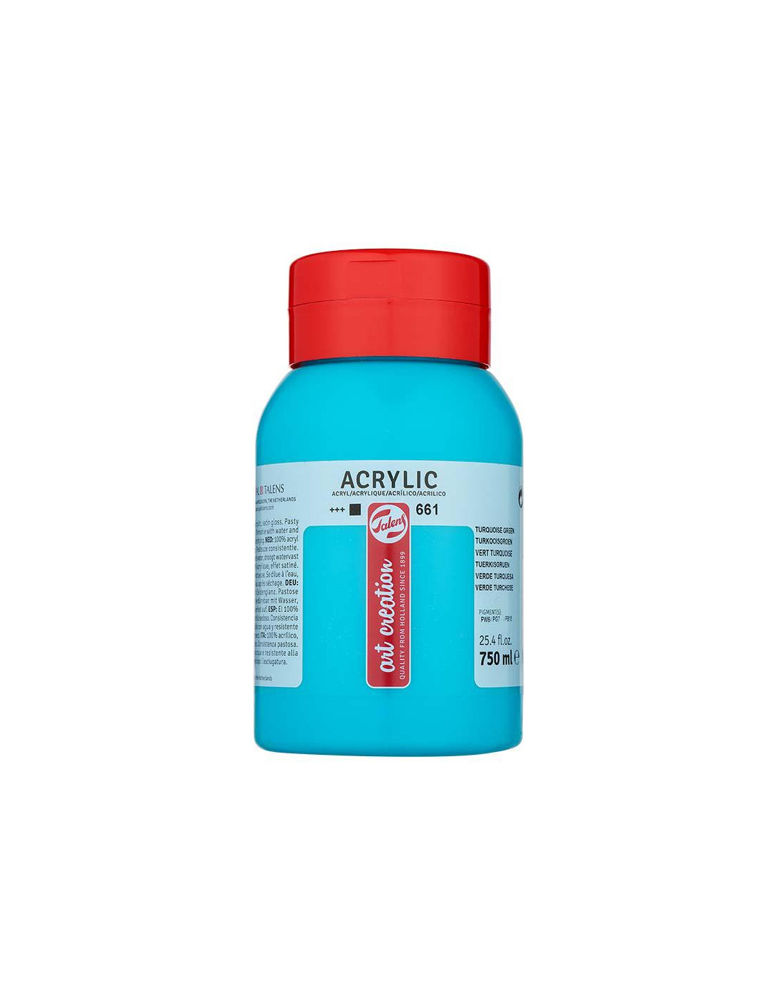 ACRILICO TALENS ART CREATION BOTE 750 ML VERDE TURQUESA 661 Un acrílico de calidad fiable a base del 100% de resina de acrilato. La pintura es pastosa, cuando está seca tiene un brillo sedoso y se puede sobrepintar casi de inmediato. Verde Turquesa (661) es un color opaco con una excelente resistencia a la luz (+++)