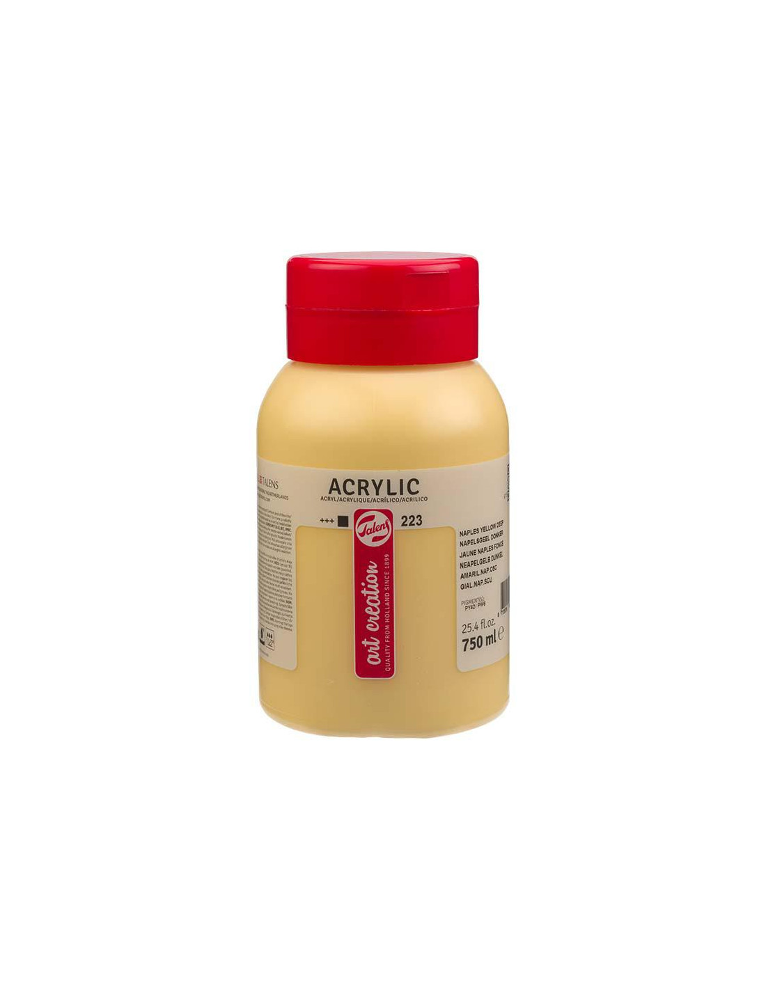 ACRILICO TALENS ART CREATION BOTE 750 ML AMARILLO NAPOLES OSCURO 223 Un acrílico de calidad fiable a base del 100% de resina de acrilato. La pintura es pastosa, cuando está seca tiene un brillo sedoso y se puede sobrepintar casi de inmediato. Amarillo Nápoles Oscuro (223) es un color opaco con una excelente resistencia a la luz (+++).