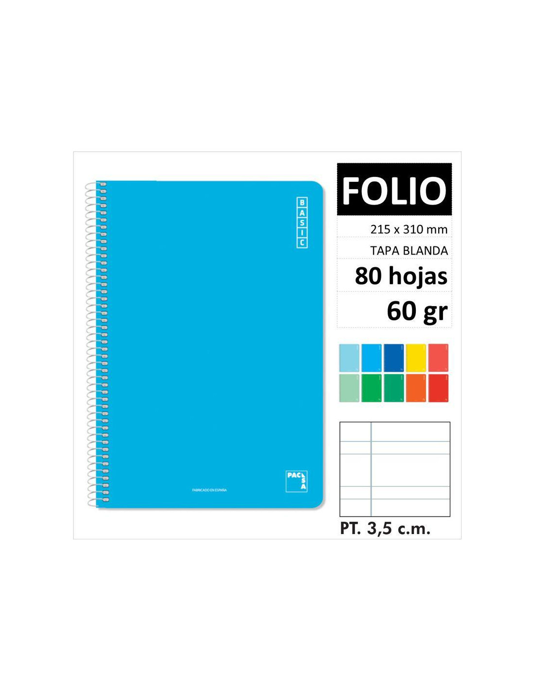 CUADERNO PACSA BASIC TAPA BLANDA FOLIO 80H 60GR PAUTA 3,5 MM MOD.16420 CUBIERTA Cartón de 400 gr./m2 Anverso plastificado en 8 colores surtidos. Reverso gris. CONTRACUBIERTA Cartón de 500 gr./m2 estucado blanco. Código de barras y descripción. Reverso gris. PAPEL Blanco 60 gr./m2 Rayado en azul. ALAMBRE Espiral con coil-lock (sólo en Fº y 4º de 80 hojas). Nylonizado blanco.