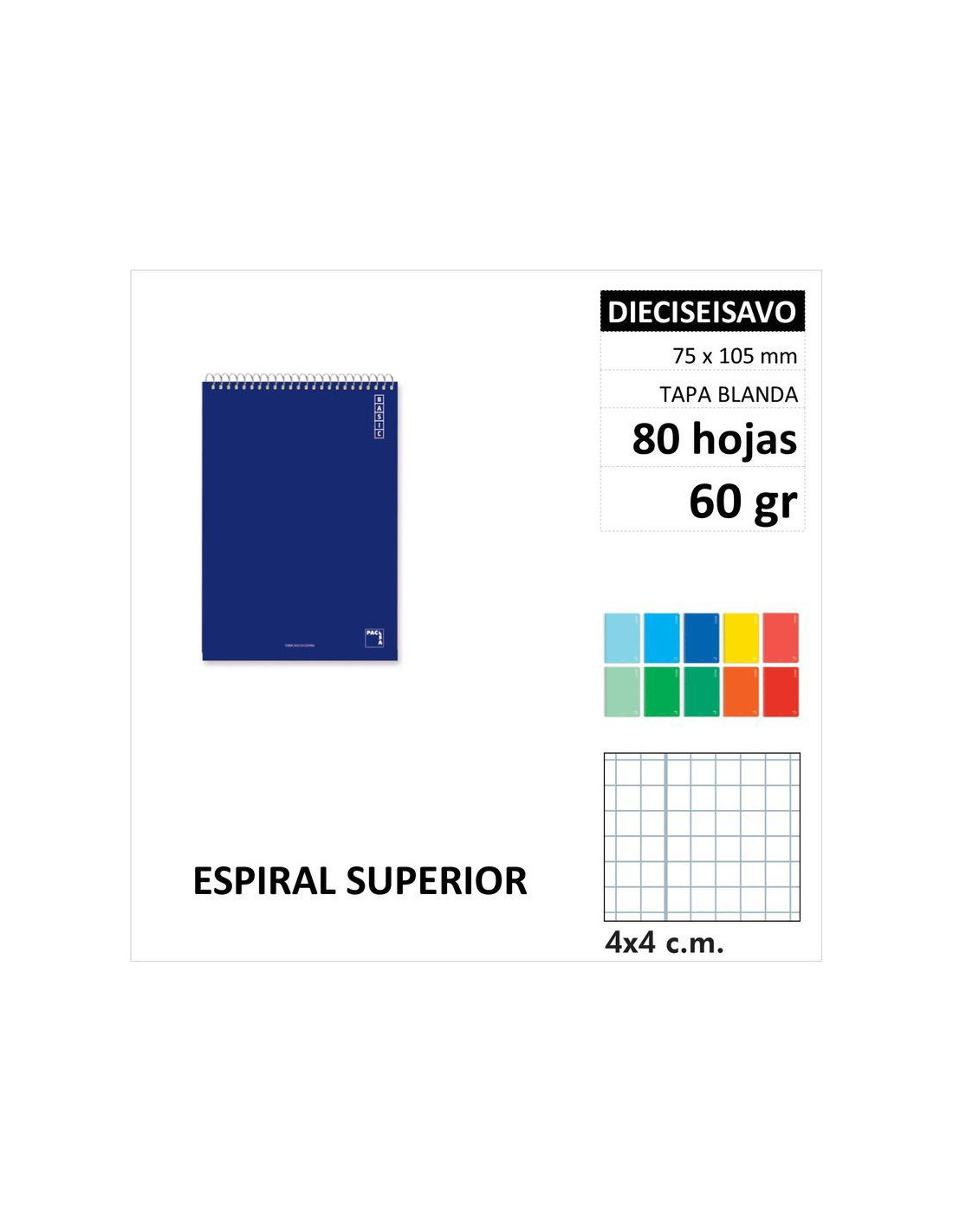 CUADERNO PACSA BASIC TAPA BLANDA 16º ESPIRAL SUPERIOR 80H 60GR CUADRO 4 MM MOD.16438 CUBIERTA Cartón de 400 gr./m2 Anverso plastificado en 8 colores surtidos. Reverso gris. CONTRACUBIERTA Cartón de 500 gr./m2 estucado blanco. Código de barras y descripción. Reverso gris. PAPEL Blanco 60 gr./m2 Rayado en azul. ALAMBRE Espiral con coil-lock (sólo en Fº y 4º de 80 hojas). Nylonizado blanco.