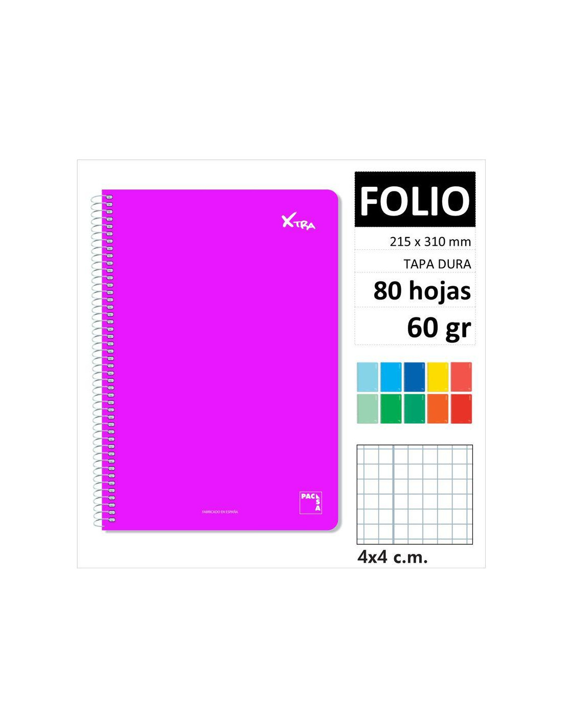 CUADERNO PACSA XTRA TAPA DURA FOLIO 80H 60GR CUADRO 4 MM MOD.16220 CUBIERTA Cartón contracolado de 800 gr./m2 Anverso plastificado. Impresión a dos colores. CONTRACUBIERTA Cartón contracolado de 800 gr./m2 Anverso plastificado con código de barras impreso. PAPEL Balnco 60 gr./m2 Rayado en azul. ALAMBRE Espiral con coil-lock nylonizado blanco.