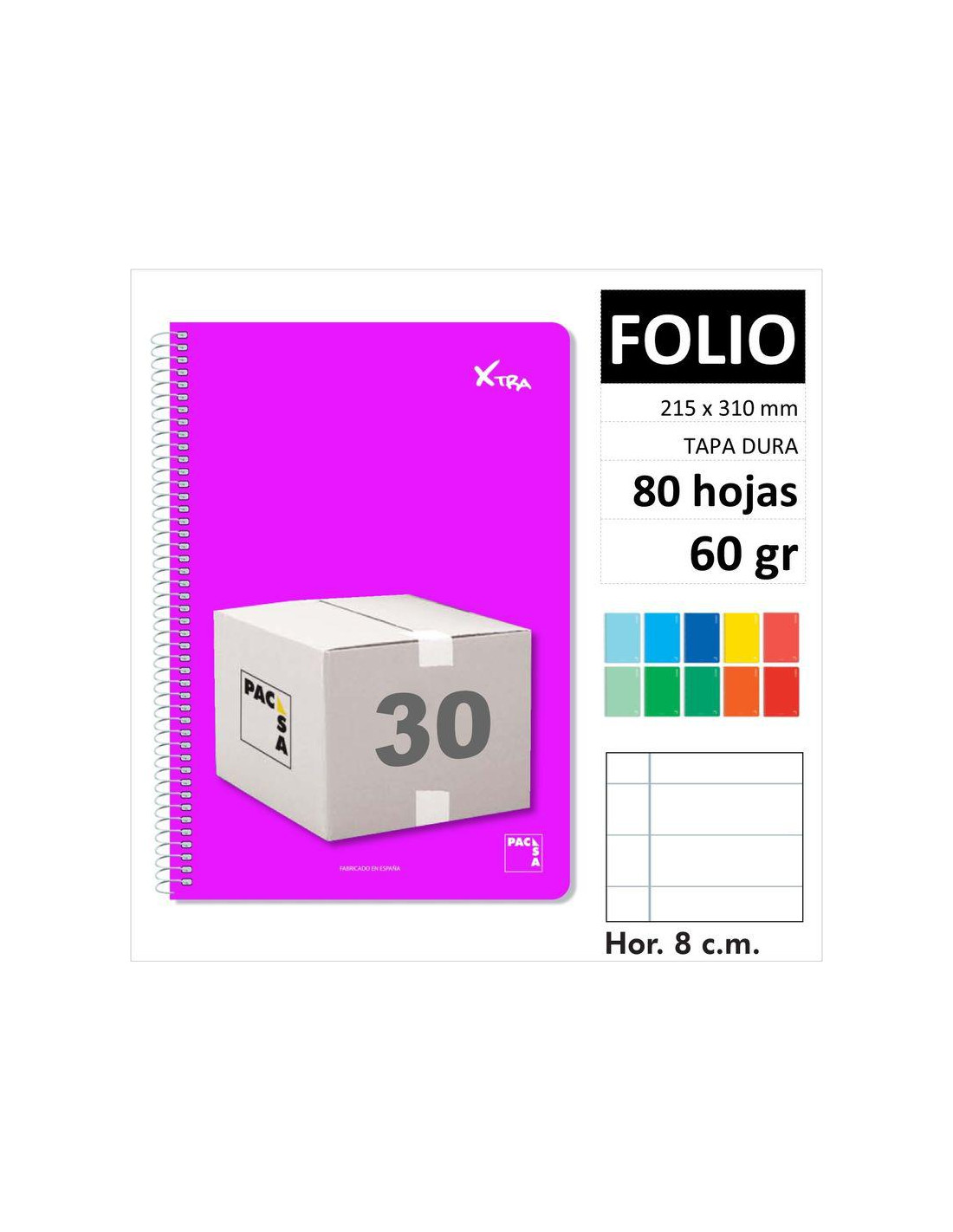 CUADERNO PACSA XTRA TAPA DURA FOLIO 80H 60GR HORIZONTAL MOD.16221 CAJA 30 UDS CUBIERTA Cartón contracolado de 800 gr./m2 Anverso plastificado. Impresión a dos colores. CONTRACUBIERTA Cartón contracolado de 800 gr./m2 Anverso plastificado con código de barras impreso. PAPEL Balnco 60 gr./m2 Rayado en azul. ALAMBRE Espiral con coil-lock nylonizado blanco.