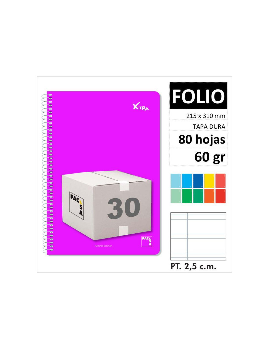 CUADERNO PACSA XTRA TAPA DURA FOLIO 80H 60GR PAUTA 2,5 MM MOD.16222 CAJA 30 UDS CUBIERTA Cartón contracolado de 800 gr./m2 Anverso plastificado. Impresión a dos colores. CONTRACUBIERTA Cartón contracolado de 800 gr./m2 Anverso plastificado con código de barras impreso. PAPEL Balnco 60 gr./m2 Rayado en azul. ALAMBRE Espiral con coil-lock nylonizado blanco.