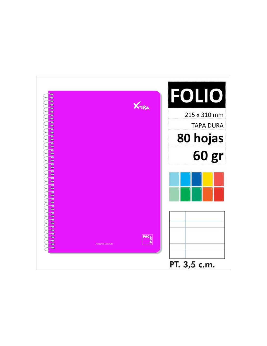 CUADERNO PACSA XTRA TAPA DURA FOLIO 80H 60GR PAUTA 3,5 MM MOD.16224 CUBIERTA Cartón contracolado de 800 gr./m2 Anverso plastificado. Impresión a dos colores. CONTRACUBIERTA Cartón contracolado de 800 gr./m2 Anverso plastificado con código de barras impreso. PAPEL Balnco 60 gr./m2 Rayado en azul. ALAMBRE Espiral con coil-lock nylonizado blanco.