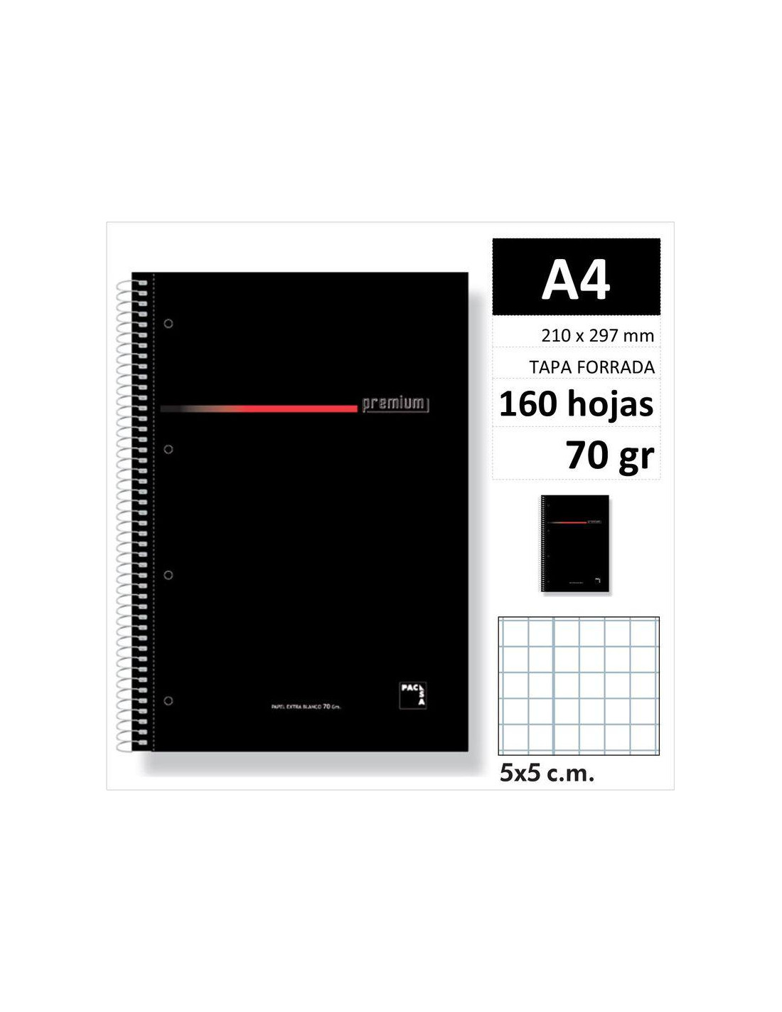CUADERNO PACSA PREMIUM TAPA FORRADA A4 160H 70GR CUADRO 5 MM NEGRO MOD.16396 CUBIERTA Cartón de 1.170 gr./m2 Forrada plastificada. CONTRACUBIERTA Cartón 1.170 gr./m2 Forrada plastificada. Código de barras y descripción impreso. PAPEL Blanco EXTRA 70 gr./m2 Rayado en azul. ALAMBRE Espiral con coil-lock nylonizado blanco.