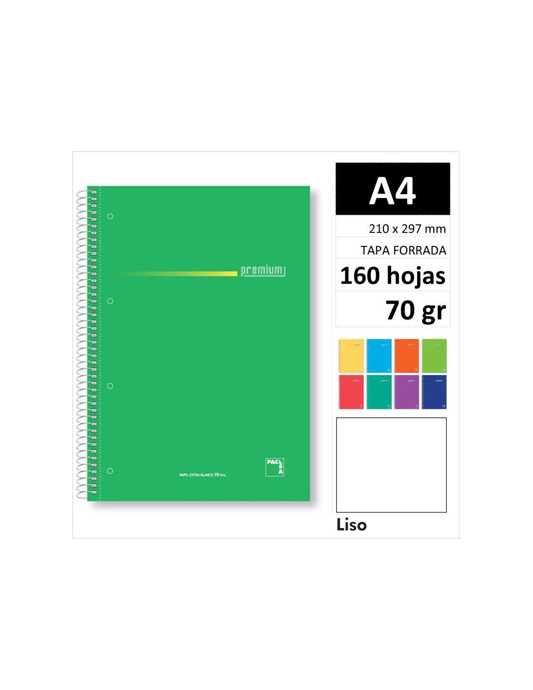 CUADERNO PACSA PREMIUM TAPA FORRADA A4 160H 70GR LISO COLORES SURTIDOS MOD.16355 CUBIERTA Cartón de 1.170 gr./m2 Forrada plastificada. CONTRACUBIERTA Cartón 1.170 gr./m2 Forrada plastificada. Código de barras y descripción impreso. PAPEL Blanco EXTRA 70 gr./m2 Rayado en azul. ALAMBRE Espiral con coil-lock nylonizado blanco.