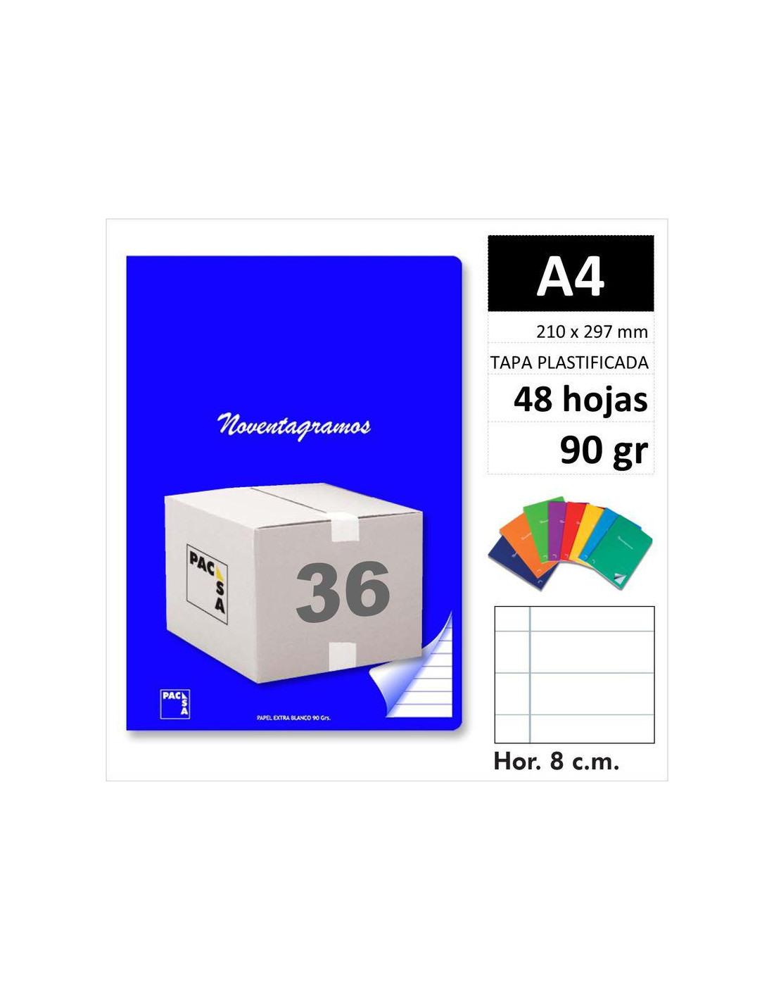 LIBRETA PACSA NOVENTAGRAMOS TAPA PLASTIFICADA A4 48H 90GR HORIZONTAL MOD.20081 CAJA 36 UDS CUBIERTA Cartulina plastificada de 275gr./m2 Impreso a dos colores. 6 colores surtidos. Indicador de rayado. CONTRACUBIERTA Cartulina plastificada de 275gr./m2 6 colores surtidos. Código de barras impreso. PAPEL Blanco EXTRA 90 gr./m2 Rayado en azul.