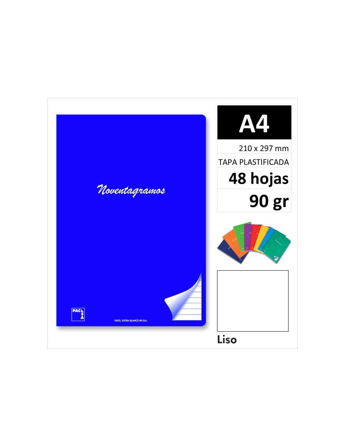 LIBRETA PACSA NOVENTAGRAMOS TAPA PLASTIFICADA A4 48H 90GR LISO MOD.20030 CUBIERTA Cartulina plastificada de 275gr./m2 Impreso a dos colores. 6 colores surtidos. Indicador de rayado. CONTRACUBIERTA Cartulina plastificada de 275gr./m2 6 colores surtidos. Código de barras impreso. PAPEL Blanco EXTRA 90 gr./m2 Rayado en azul.