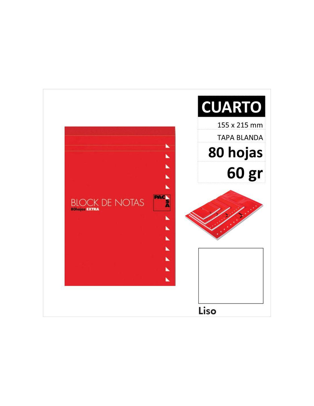 BLOC NOTAS PACSA CON TAPA CUARTO 80H 60GR LISO MOD.18903 CUBIERTA Cartón de 240 gr./m2. Impresión a dos colores. Plastificada. Reverso en gris. CONTRACUBIERTA Cartón de 450 gr./m2 Anverso blanco. Reverso gris. Código de barras. PAPEL Blanco 60 gr./m2 HOJAS Trepadas para el arranque limpio. Sujetas con grapas y cinta lomera decorativa.