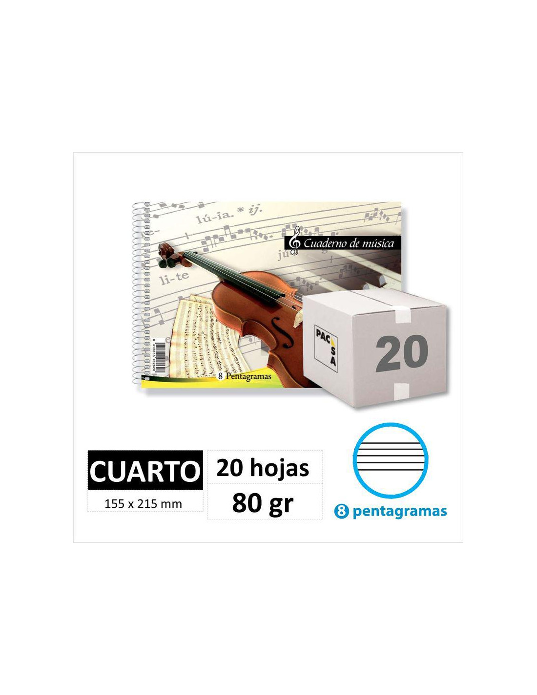 CUADERNO MÚSICA PACSA CUARTO 20H 80GR 8 PENTAGRAMAS MOD.18801 PAQUETE 20 UDS CUBIERTA Cartón de 325 gr./m2 Anverso barnizado. Impreso a dos colores. Código de barras. Reverso gris CONTRACUBIERTA Cartón de 325 gr./m2 Reverso gris. PAPEL Blanco EXTRA 80 gr./m2 ALAMBRE Espiral sencillo nylonizado blanco.
