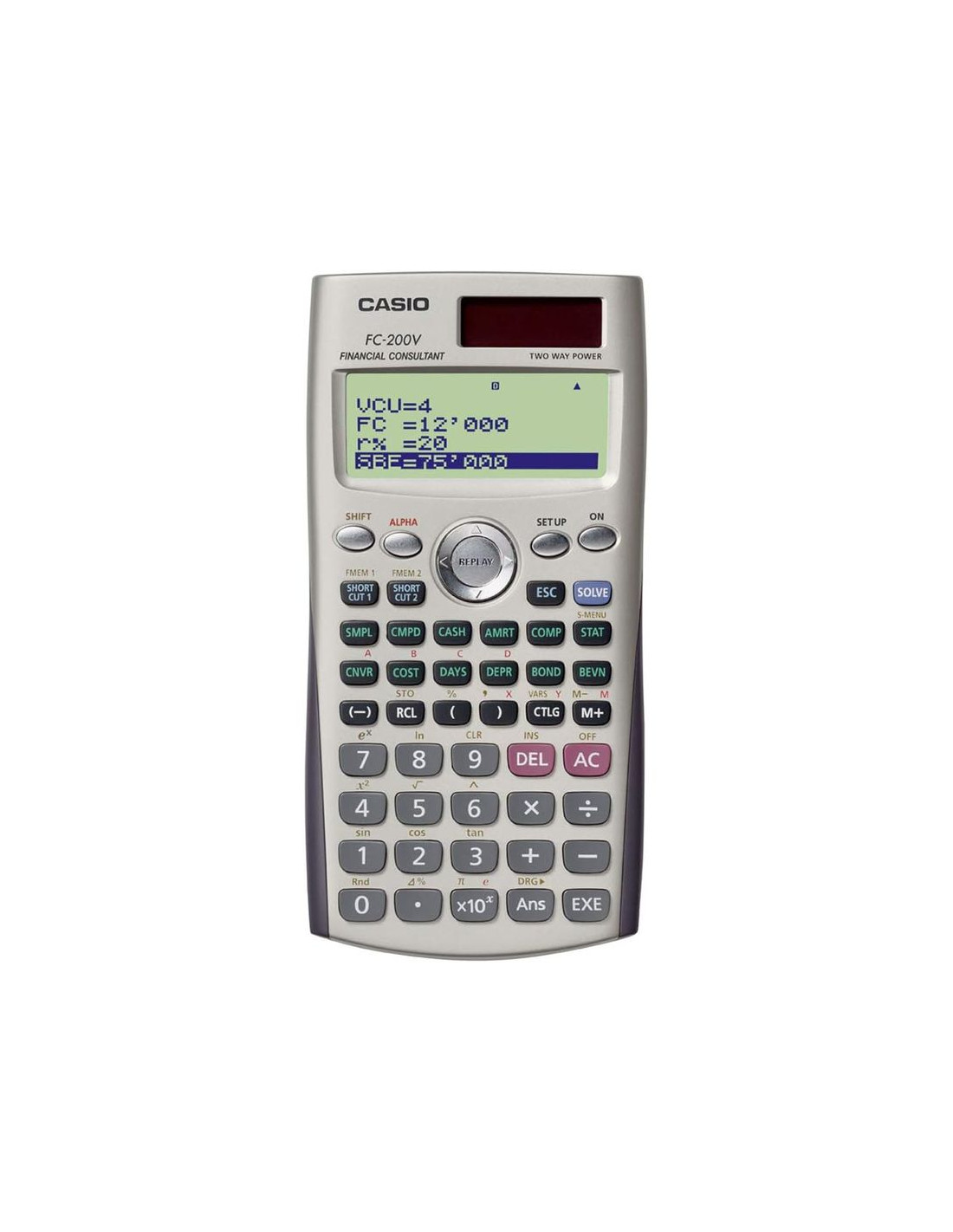 CALCULADORA CASIO FINANCIERA FC-200V EN BLISTER Recomendada para exámenes financieros Resuelve los enigmas de los cálculos financieros con sus exclusivas funciones de gran alcance incorporadas. Tecla de modo directo y nueva operación Pulse la tecla de modo directo integrada para cambiar entre los modos exclusivos cuando realice cada cálculo financiero. El modelo FC-200V incorpora una pantalla de 4 líneas de punto completo que permite introducir, confirmar, cambiar y corregir cada parámetro fácilmente. También ofrece la práctica función de presentación de marcadores de coma a cada 3 dígitos. Tecla de acceso directo Los valores de parámetros o ajustes usados en los cálculos se pueden memorizar y se pueden recuperar los datos almacenados para usar en cálculos similares. Una función muy eficaz para cálculos repetidos. Especificaciones generales ? Pantalla de 4 líneas: Matriz de puntos 31 * 96 Dígitos de mantisa y exponente: 10 + 2 ? Teclas de plástico ? Alimentación: pilas AAA y panel solar ? Nueva tapa deslizable ? Dimensiones (Alt. x Anch. x Prof.): 12,2 x 80,0 x 161,00 mm ? Peso: 103 g ? EAN-Code: 49-71850-167006 (junio: 172130) blister (FC-200V-S-EH) ? Caja (Lar. x Anch. x Alt.): 245,0 x 155,0 x 43,1 mm ? Peso total: 363,7 g ? Idiomas: inglés, español, francés Especificaciones detalladas ? Formato de entrada: V.P.A.M ? Cálculos de funciones: trigonométricos, hiperbólicos, logarítmicos, exponenciales, de potencia / raíz cuadrada, inversos, de operador factorial, generador de números aleatorios ? Reproducción: Historial ? Memoria: para respuestas (Ans), STO, RCL (A-D, X,Y, M (7)) ? Cálculos de porcentajes ? Ajuste del número en pantalla: Fix, Sci, Norm, símbolo separador de cada 3 dígitos ? Ajuste de ángulos: Deg, Rad, Gra ? Tabla de edición de estadísticas ? Elementos de cálculo ? Regresiones: lineales, logarítmicas, exponenciales, de potencia, inversas, cuadráticas ? Cálculos financieros: interés simple, compuesto TVMn, P/Y, C/Y, evaluación de inversión (flujo de efectivo), amortizaciones, conversiones, cálculo de coste, precio de venta o margen de ganancia, cálculos por días ? Cálculo de bonos: precio de compra, rendimiento anual ? Depreciación: método lineal y de porcentaje fijo, suma de los dígitos del año, saldo decreciente ? Cálculo de punto de equilibrio: cantidad e importe de ventas del punto de equilibrio, cantidad de ventas con el interés esperado y con la tasa de interés esperada, margen de seguridad y grado de influencia operativa, combinada y financiera