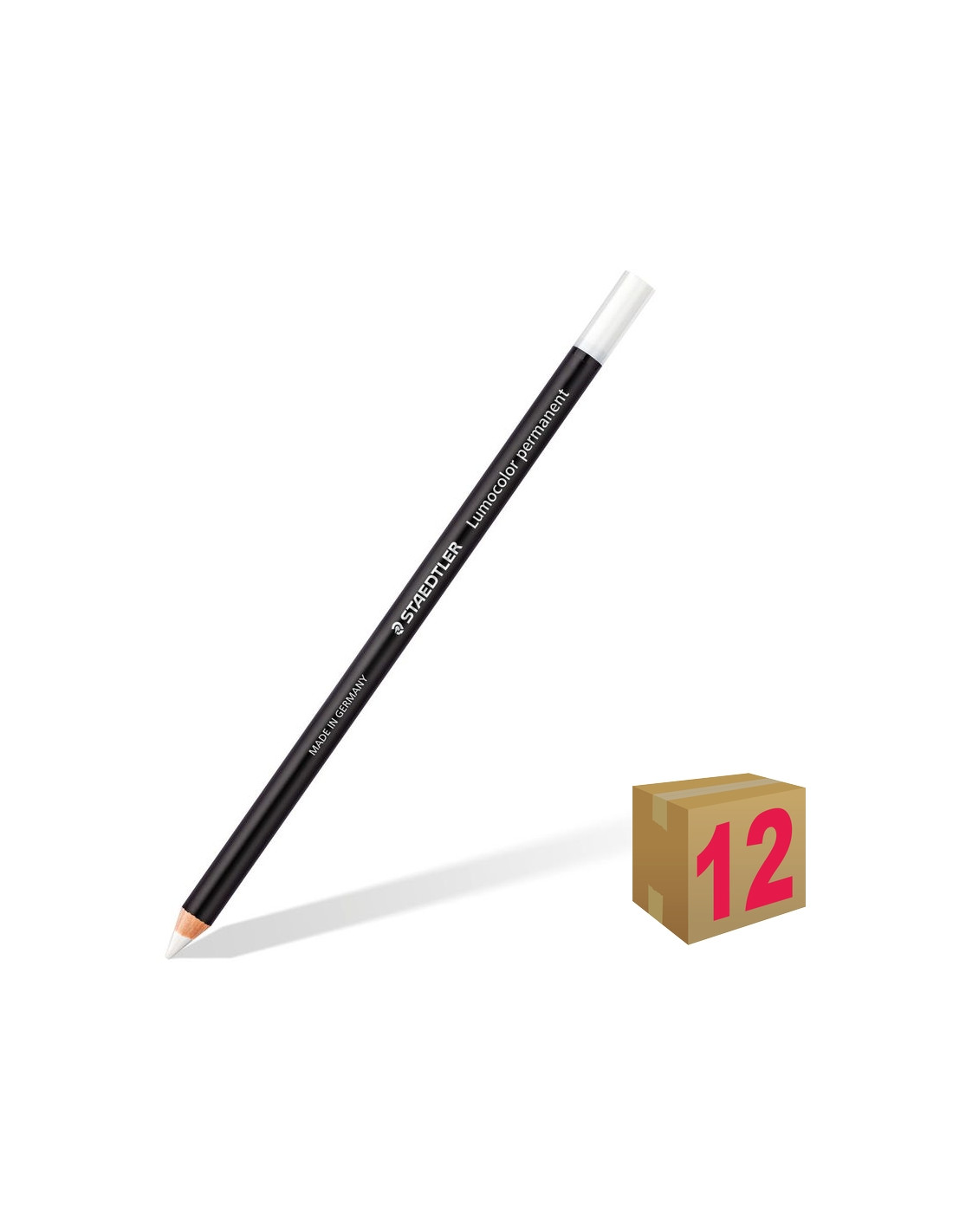 LÁPIZ STAEDTLER LUMOCOLOR GLASOCHROM BLANCO CAJA 12 UDS Lápiz de madera resistente al agua. Para el marcado opaco en casi todas las superficies, incluso oscuras o transparentes, papel, plástico, metal, cristal, madera, piel y piedra. No traspasa el papel. Pigmentos de color no corrosivos. Madera certificada, procedente de bosques de gestión sostenible.