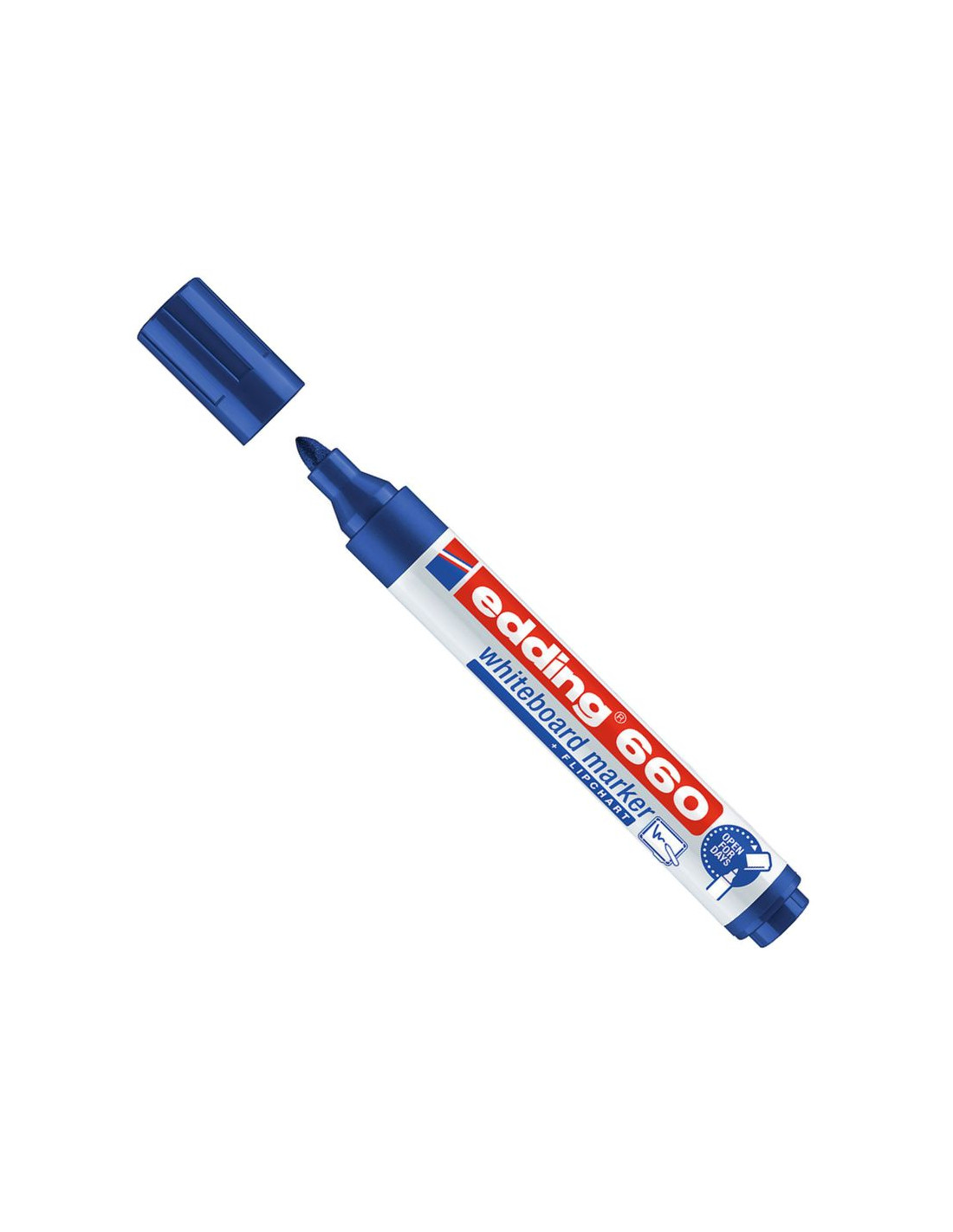 ROTULADOR PIZARRA BLANCA EDDING 660 AZUL. edding 660 marcador para pizarras blancas: el aliado fiable Tras una reunión intensa o al dejar un mensaje en casa con las prisas puede suceder que uno se olvide de volver a tapar el marcador. Con el marcador para pizarras blancas edding 660 no hay por qué preocuparse. Puede dejarse destapado durante varios días sin secarse, para que cualquiera pueda usarlo inmediatamente. Y lo que es aún mejor, la escritura puede borrarse fácilmente de cualquier pizarra blanca sin dejar ni rastro. Este edding también escribe perfectamente sobre otras superficies lisas no porosas, como esmalte, vidrio o melamina. Su punta redonda garantiza un trazo uniforme, es resistente a la acción de la luz y de secado rápido. Es la solución fiable para cualquiera que use pizarras blancas constantemente. Marcador de pizarra blanca para escribir y marcar sobre pizarras blancas y también adecuado para flipcharts El texto escrito se puede borrar en seco de prácticamente todas las superficies no porosas, tales como esmalte y melamina El grosor de trazo de la punta redonda es de 1,5-3 mm Gracias a la tecnología cap-off, el producto no se seca aunque se deje sin la tapa puesta durante varios días (prueba climática según ISO 554) La tinta del marcador para pizarras blancas es resistente a la acción de la luz y de secado rápido Artículo disponible en los colores negro, rojo, azul y verde El producto es rellenable con la tinta de recarga edding BTK 25 Sin adición de butilacetato